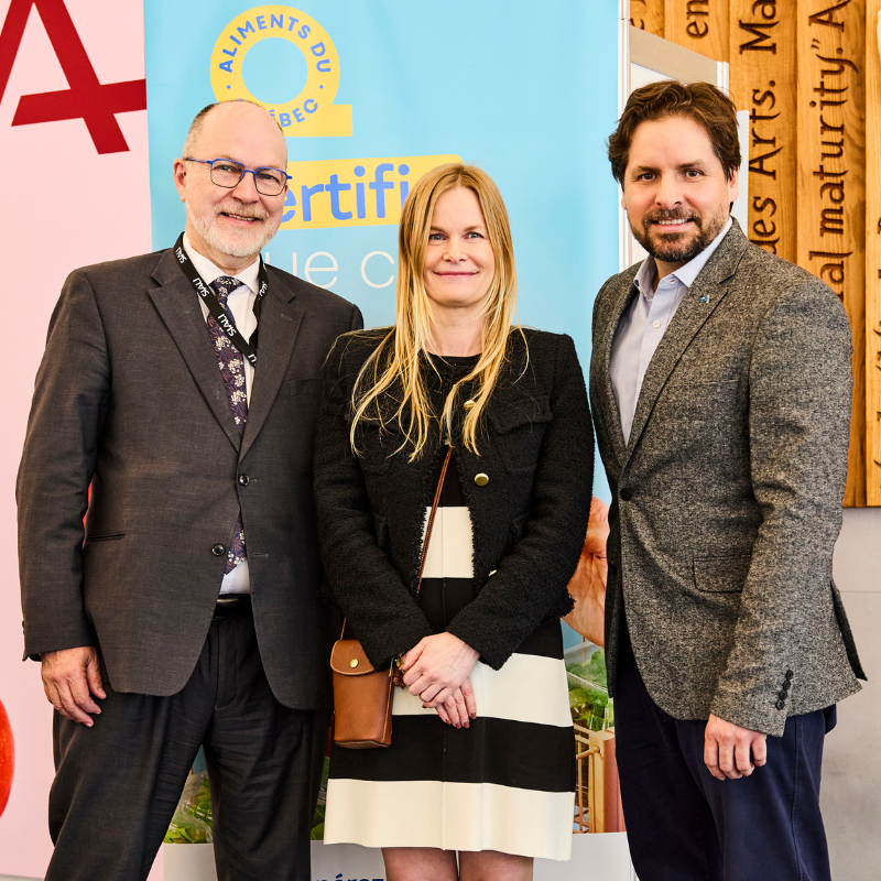 De gauche à droite : Yvon Doyle, sous-ministre adjoint aux pêches, à l’aquaculture, au commerce, à la transformation et aux relations intergouvernementales, Isabelle Roy, directrice générale d'Aliments du Québec et Pierre-Alexandre Drouin, président du CA d'Aliments du Québec.