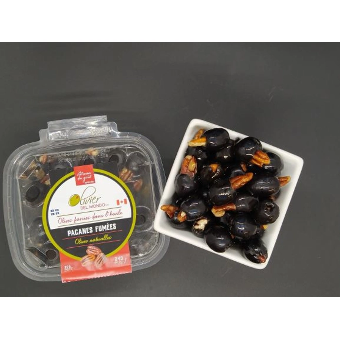 Olives noires farcies d'une pacane qui est ensuite fumée a chaud dans notre fumoir. Pour les amateurs d'olives n'aimant pas trop l'amertume des olives vertes et qui désir un produit légèrement fumé et...