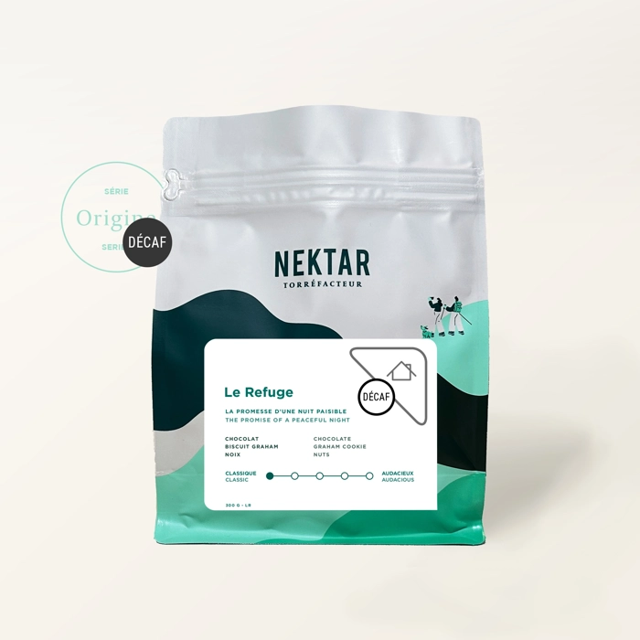 Un décaféiné riche, aux goût chocolaté et des notes de noix. Parfait en allongé ou en latté.