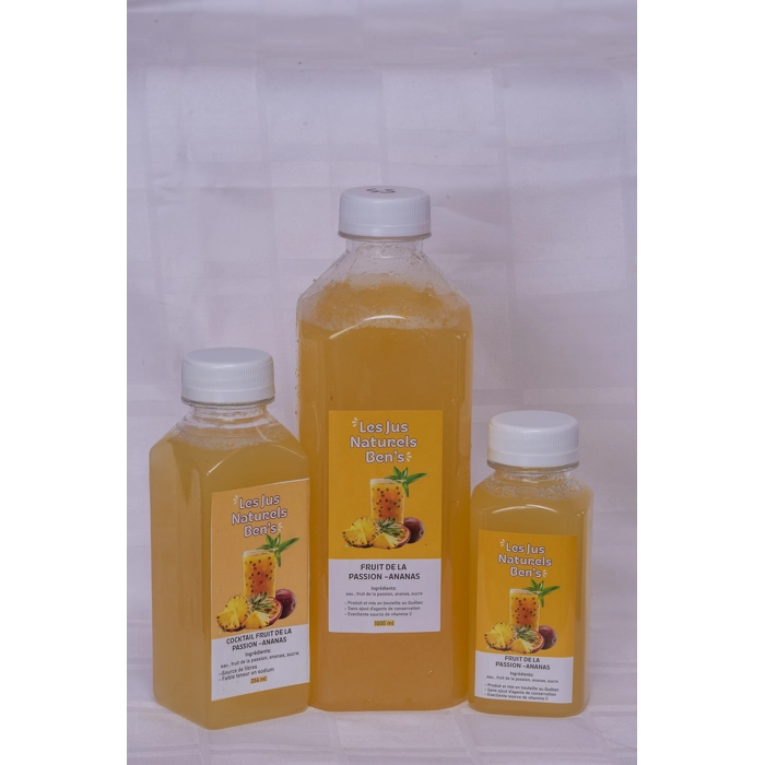 jus 100% naturel fait d'un mélange d'ananas et de fruit de la passion
