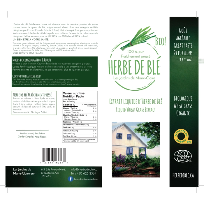 Entreprise Biologique qui se spécialise dans la transformation de jus d herbe de blé L élixir de vie .Produit distribuer dans les magasins d aliments naturel .Retrouver énergie et vitalité.Rachel Berry, Magasin Tau, Magasin Avril et autre épicerie naturel.
