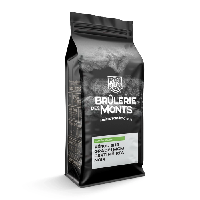 De la région de Chanchamayo, torréfaction Noir(Français), aromes fumés, notes de crème brulé, corps modeste, propose une fin en bouche claire