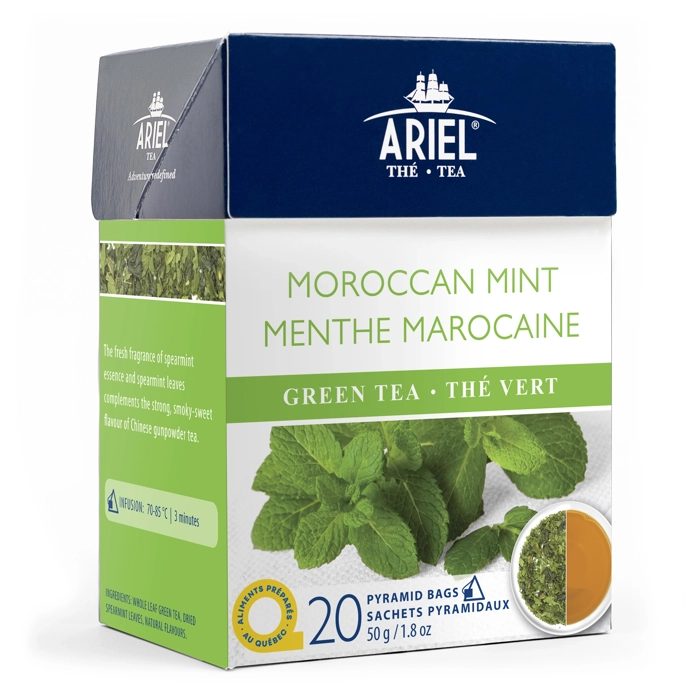 Le frais parfum de l’essence et des feuilles de menthe verte se marie à la saveur intense et légèrement fumée du thé Gunpowder chinois.
