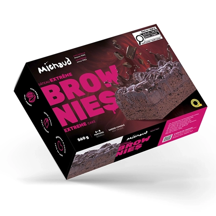 Pâte chocolatée avec fondant maison au chocolat noir 52 % faite de crème 35 %, recouverte de cubes de brownies et d'un miroir chocolat noir.