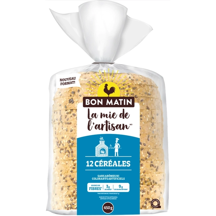 Le pain 12 céréales de style artisanal Bon Matin La mie de l'artisan dévoile son goût délicieux dans chaque bouchée. Il comprend 3 g de fibres et 9 g de grains entiers par portion, ce qui en fait un p...