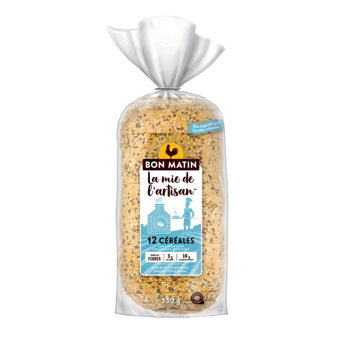 Le pain 12 céréales de style artisanal Bon Matin dévoile son goût riche dans chaque bouchée. Il comprend 3 g de fibres et 14 g de grains entiers par portion, ce qui en fait un pain tout aussi délicieu...
