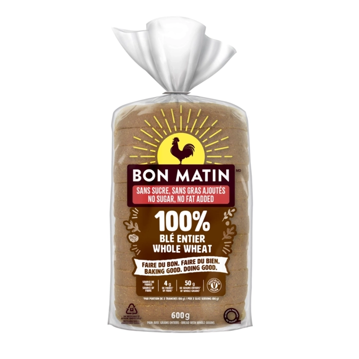 Profitez des bienfaits des grains entiers grâce au pain à 100 % de blé entier sans sucres, sans gras ajoutés Bon Matin. Regorgeant d’ingrédients nutritifs, ce pain sans sucre ni gras ajoutés contient ...