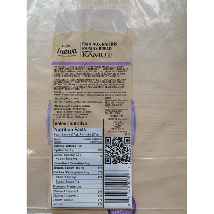 Notre pain aux raisins se distingue des autres en étant biologique et fait de farine de Kamut. Il contient moins de 1% de Gluten.