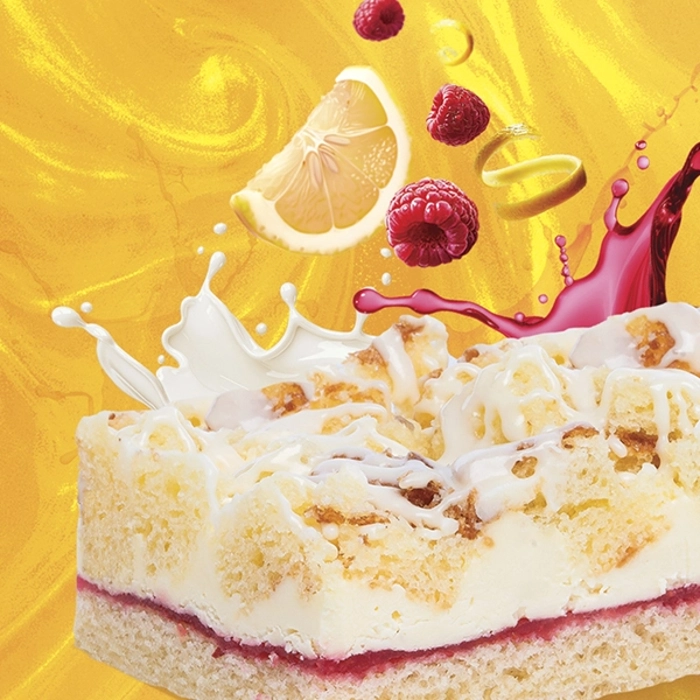Pâte vanille recouverte de garniture aux framboises et d'une mousseline au citron, décorés de cubes de pâte vanille et ligné de chocolat blanc.