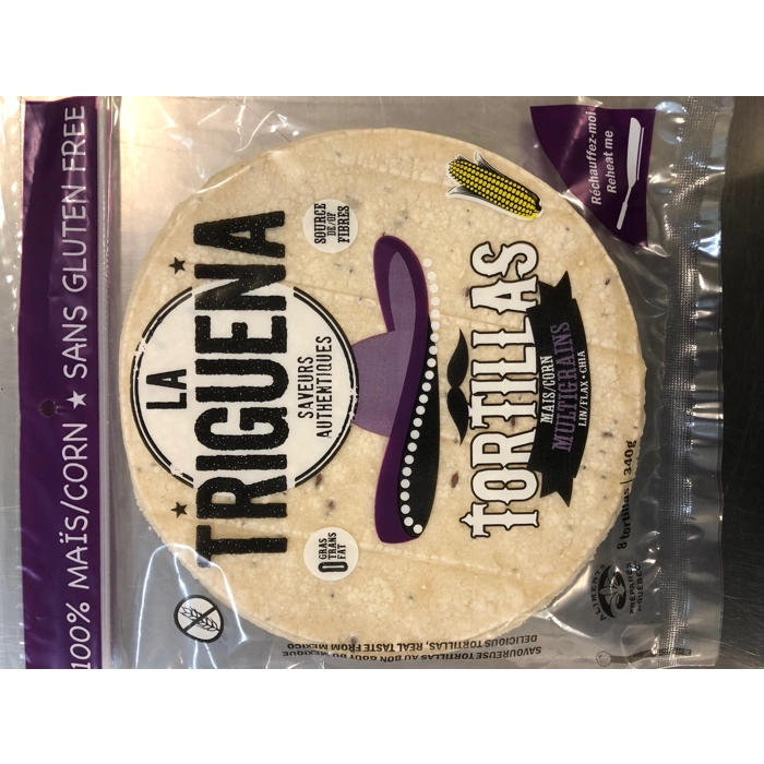 Tortilla de maïs multigrains avec des grains de lin et chia et sans gluten.