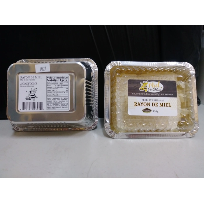 Rayon de miel bâtit par les abeilles. Comprend de la cire comestible et du miel de trèfle.