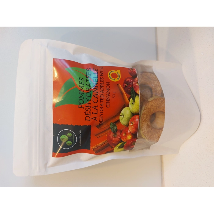 Les pommes déshydratées proviennent de producteurs locaux du Québec. Un fruit parfaitement sucré de chez nous. L’ajout de la canelle en fait une collation de qualité.
