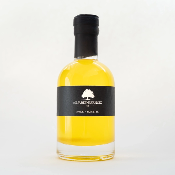 Huile de noisettes pressée à froid, Fabriquée et embouteillée par Au jardin des noix. Un substitut formidable dans les vinaigrettes et comme huile de finition sur des légumes grillés. Cette huile de n...