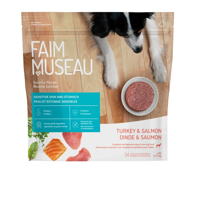 Cette recette est notre surf’n turf à la mode canine! Du saumon frais et de la dinde 100% canadienne. Grâce aux oméga-3 du saumon, cette formule contribuera à redonner brillance et douceur au pelag...