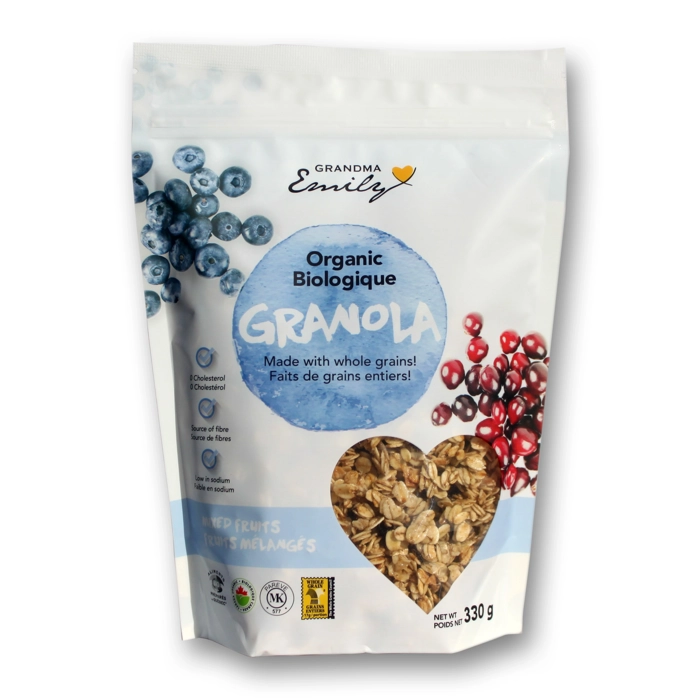 Fruits mélangés - 100% bioMélange d'avoine, noix, noix de coco, bleuets, canneberges et raisins légèrement sucrée au nectar d'agave.source élevée de fibres - 0 gras trans - source de fer - 0 sodium - ...
