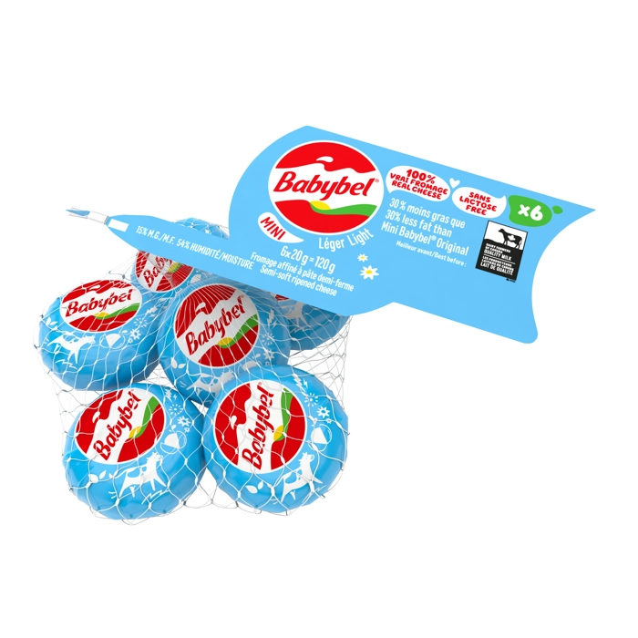 Le Babybel Léger compte 30 % moins de gras que le Babybel Original par portion de 20 g, mais conserve tout son bon goût. Il est source de calcium et sans lactose.