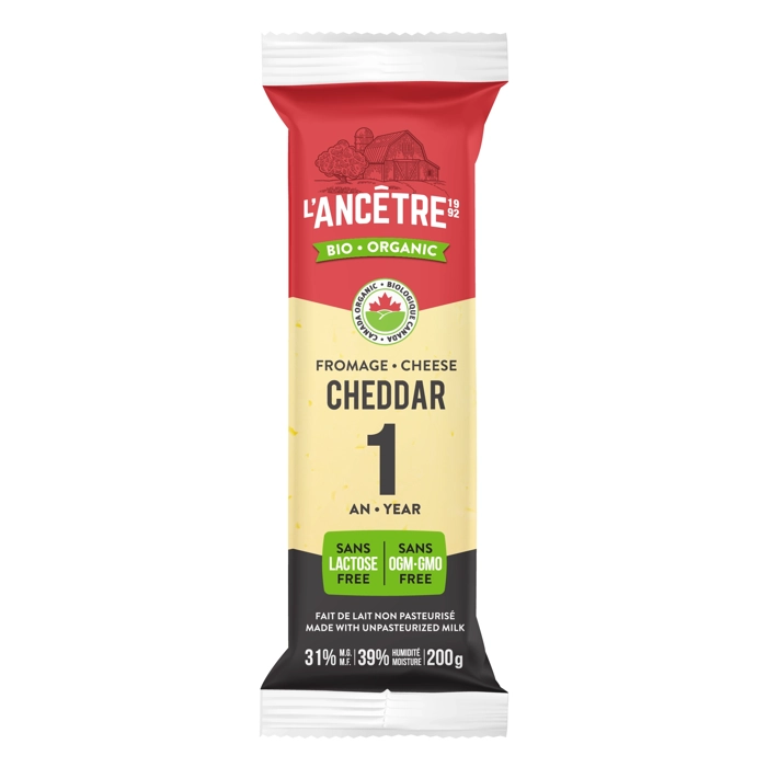 Cheddar vieilli 1 an, certifié biologique, sans lactose, sans gluten, sans OGM et sans présure animale. Fait de lait pur à 100 %.