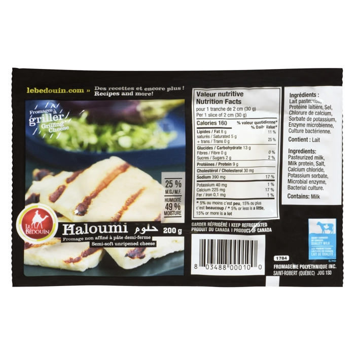 Fromage à griller semi ferme, fait de lait de vache pasteurisé, au goût salé.