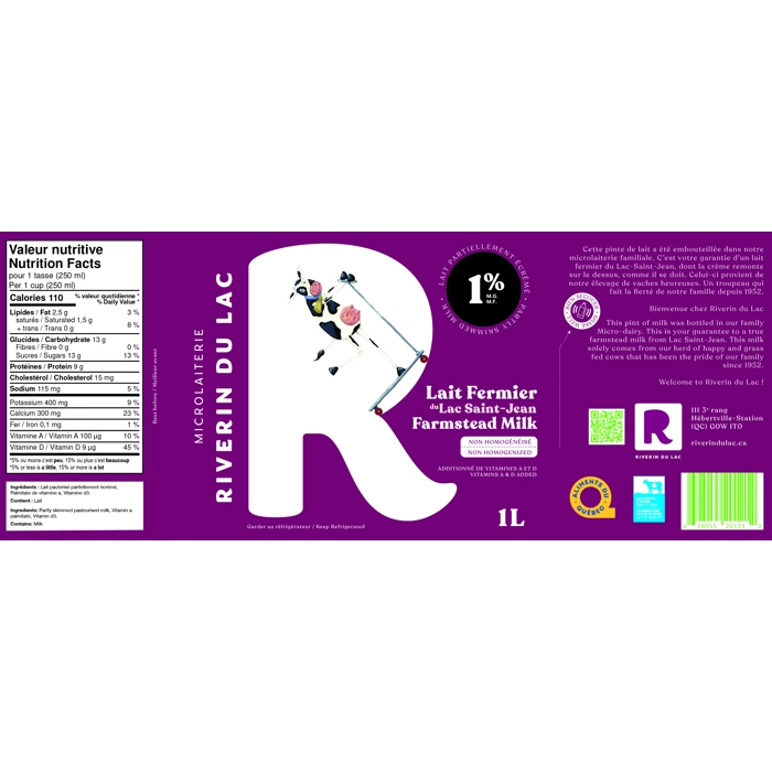 lait fermier 1% non homogénéisé provenant de notre petit troupeau holstein.