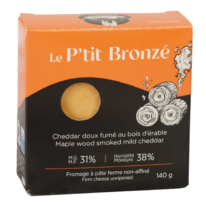 Le P'tit Bronzé est un cheddar doux fumé à froid au bois d'érable.