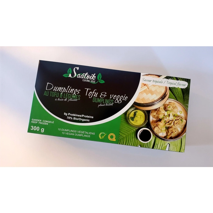 Dumplings garnis de tofu et légumes avec une texture moelleuse et à la saveur tropicale.