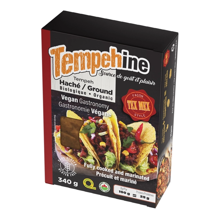 Tempeh haché biologique saveur Tex-Mex, une excellente source de protéine végétale.