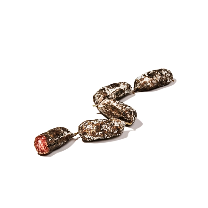 Façonné à partir de maigre noble de porc du Québec, le grelot des battures est un saucisson tendre et fondant, fabriqué en pans de quinze à vingt boules. L’ajout d’un pesto de persil de mer à la mêlée...