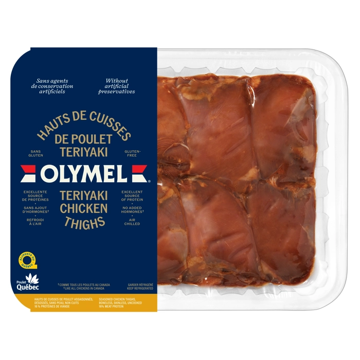 Hauts de cuisse de poulet Teriyaki assaisonnés, désossés, sans peau, non cuits, 16 % protéines de viande