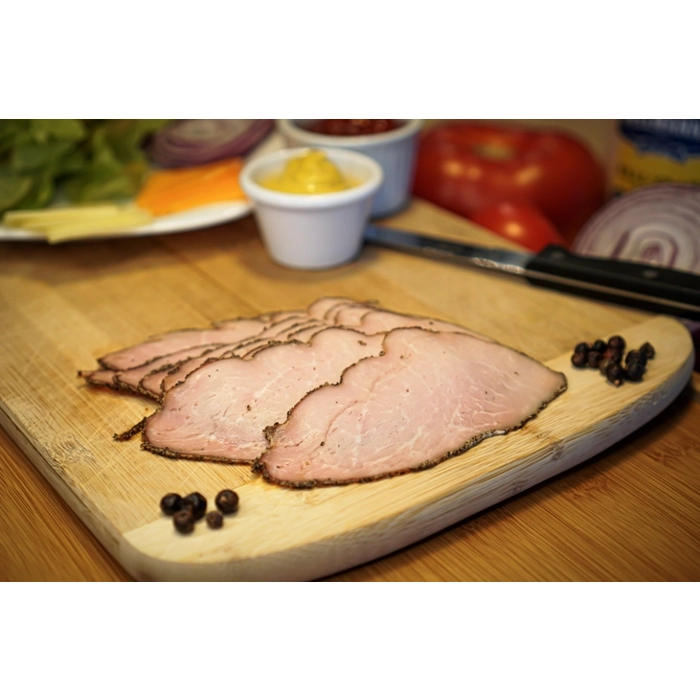 Notre jambon poivré est un produit cuit, prêt à la consommation, qui se caractérise par un enrobage aux poivres et une saveur authentique de jambon artisanal.