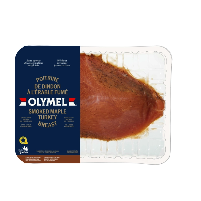 Poitrines de dindon à saveur d'érable fumé, assaisonnées, désossées, sans filets, sans peau, non cuites, 20 % protéines de viande