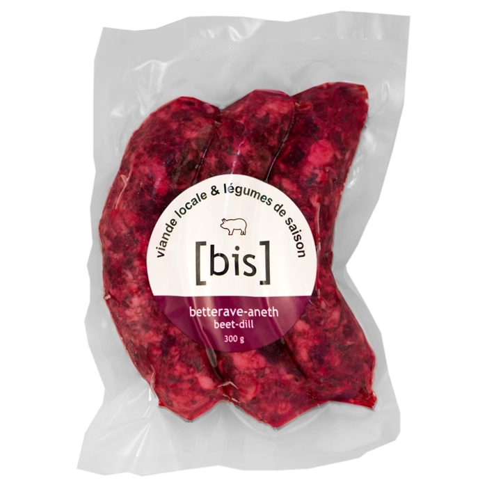 Saucisses fraiches 100% porc du Québec avec 35% de betteraves bio et fines herbes fraiches.