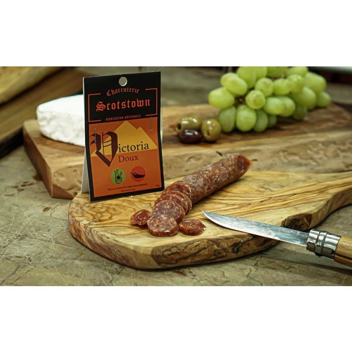 Notre saucisson sec Victoria doux est un produit affiné, prêt pour la consommation, qui se caractérise par ses profils aromatiques de fenouil et de piment. C'est un saucisson légèrement pimenté.