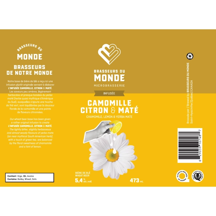 Notre base de bière de blé a reçu ici une infusion plutôt originale servant à élaborer L’Infusée camomille, citron & maté. Les saveurs peu amères, légèrement herbacées et presque boisées du yerba ...