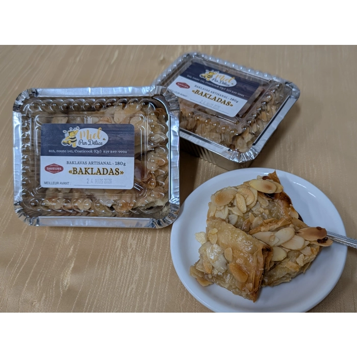 Prêt à manger à base de miel, fait d'une demi- pâte phyllo, beurre, amandes et sirop de miel.