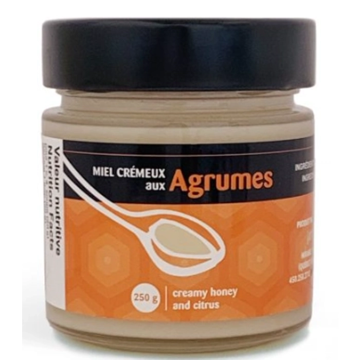 Miel crémeux, très onctueux avec ajout d’huiles essentielles d’agrumes.