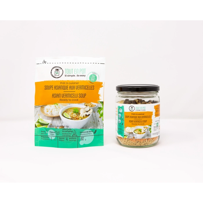 Soupe prête à cuisiner fait d'ingrédients déshydratés. Le client ajoute les ingrédients liquides au mélange d'ingrédients secs et le cuit selon les instructions inscrites sur l'étiquette du produit.