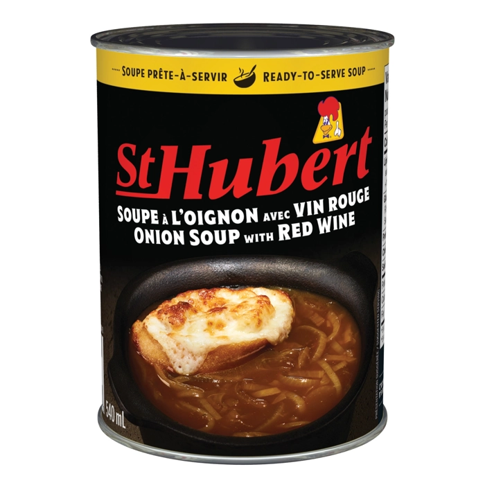 Soupe au délicieux goût de boeuf et d'épices rehaussée de vin rouge avec une généreuse portion d'oignons.