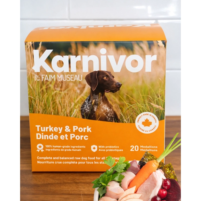 Une recette sans poulet, idéale pour les chiens sensibles ou simplement pour varier le menu. La dinde et le porc forment un duo de protéines complètes qui soutiennent la force musculaire et fournissen...