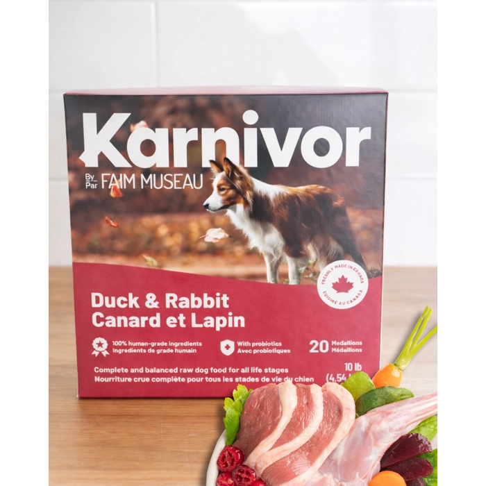 Le canard et le lapin forment un duo de protéines particulièrement douces pour les chiens sensibles : peu allergènes, faciles à digérer et naturellement riches en nutriments. Le lapin — avec sa viande, ses abats et ses os finement broyés — fournit des éléments essentiels pour soutenir la peau, la vitalité et le confort digestif. Le canard, quant à lui, contribue à un pelage en santé et à une énergie stable au quotidien.