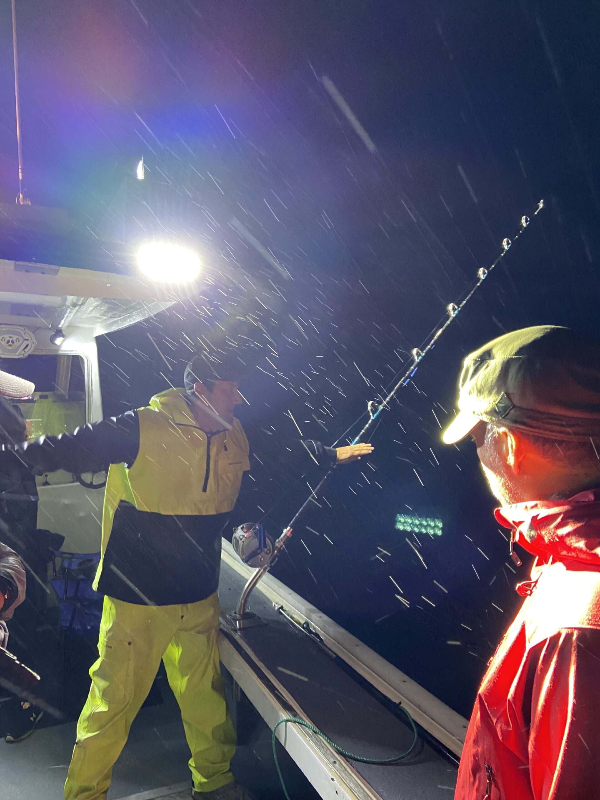 Tous à bord du bateau de Jimmy Lepage à 19h. La nuit est calme et silencieuse : parfaite pour ne pas effrayer les thonidés !