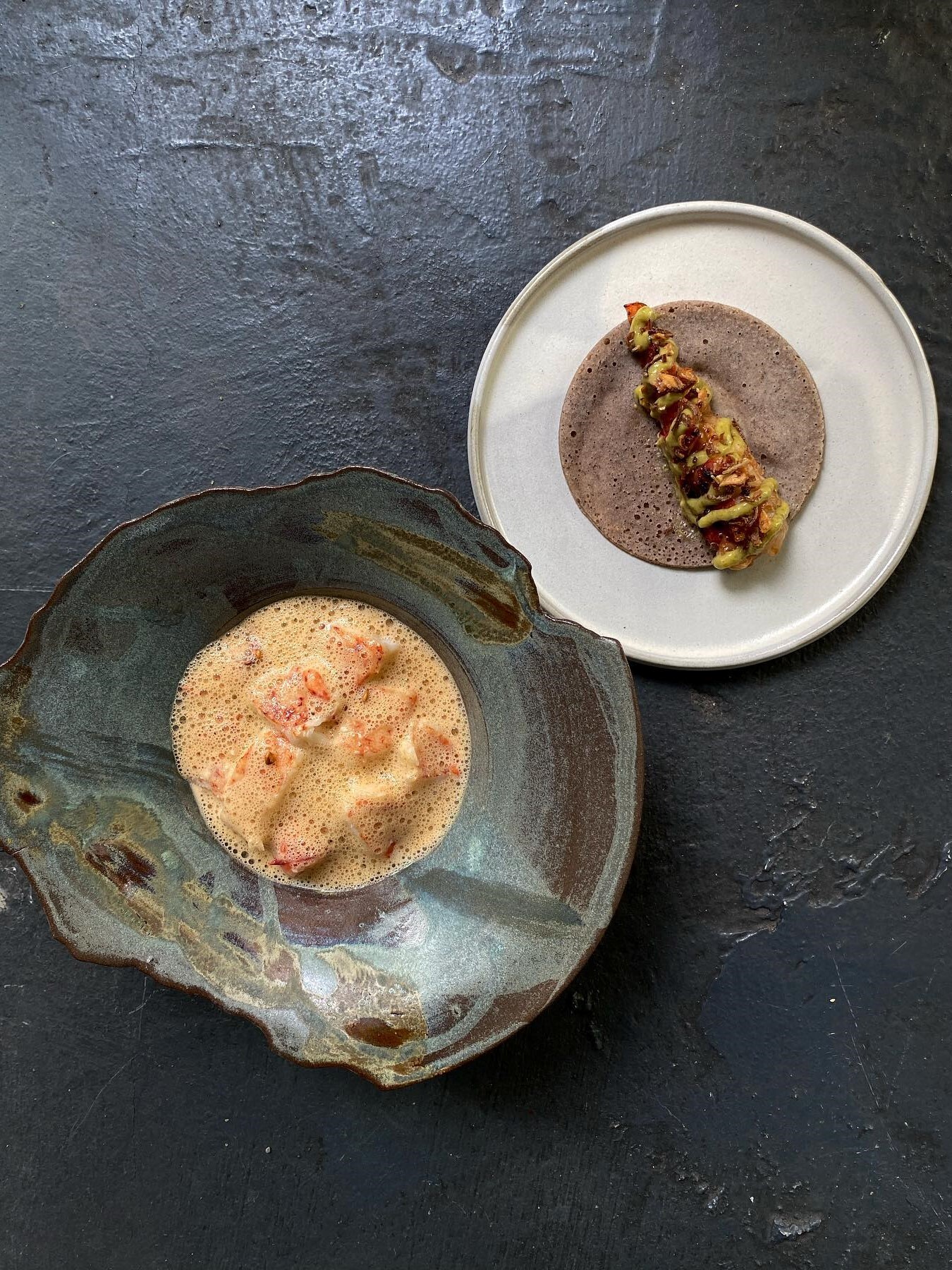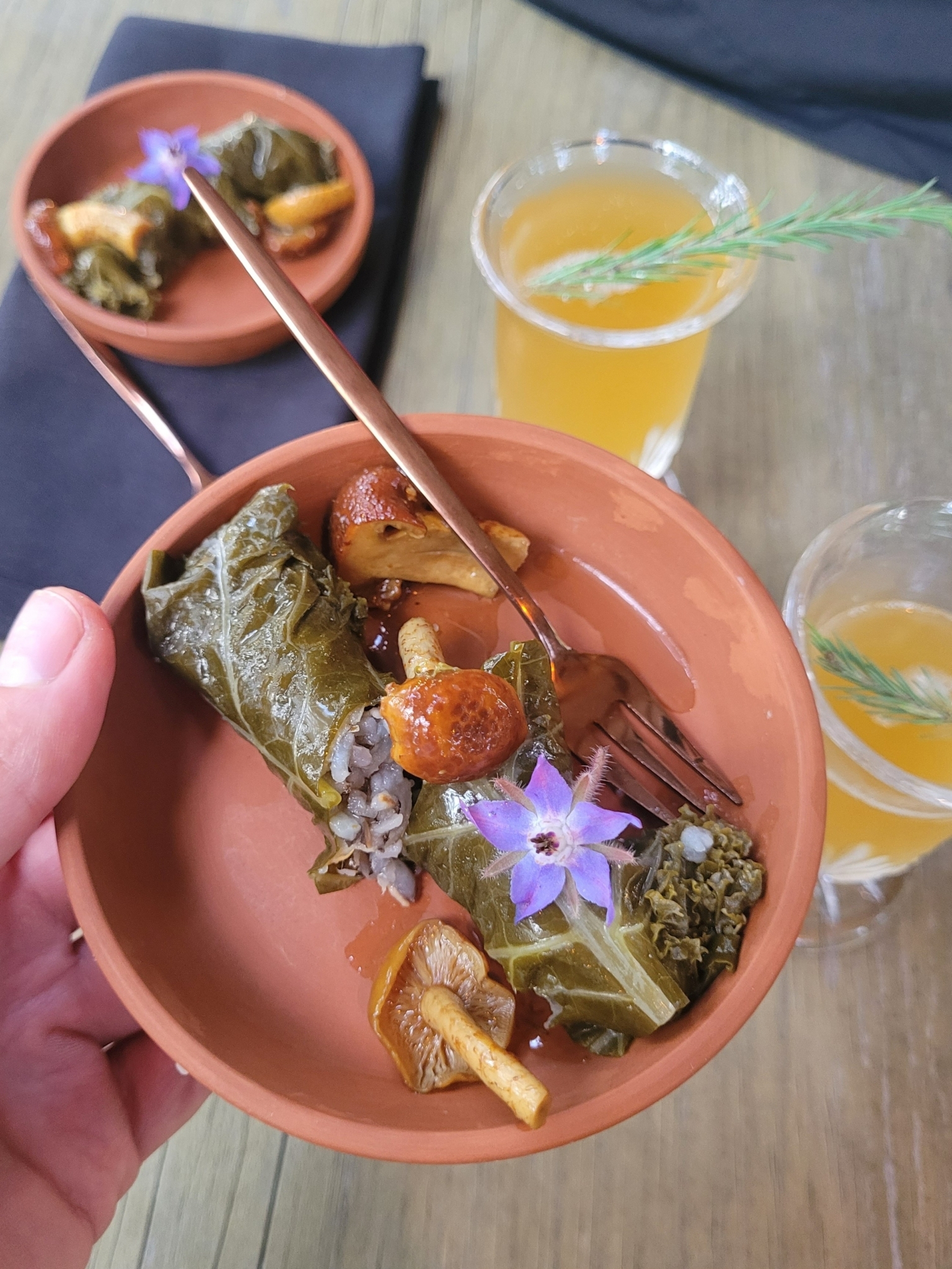 Toutefois, le travail débute bien avant ; des semaines, voire des mois à l’avance, puisque le duo chef-fe Pierre-Olivier Pelletier et Cassandre Osterroth font eux-mêmes la cueillette de nombreux ingrédients (foin d’odeur, mélilot, verges d’or, roses sauvages, bouton de marguerite) qu’ils utiliseront à bon escient tout au long de l’année. J’ai adoré que l’éducation soit au cœur de l’expérience ; des produits, des artisans, des techniques. Mon plat coup de cœur de la soirée fut le homard travaillé en deux façons. Voici une petite table qui en fait grand pour le Québec !