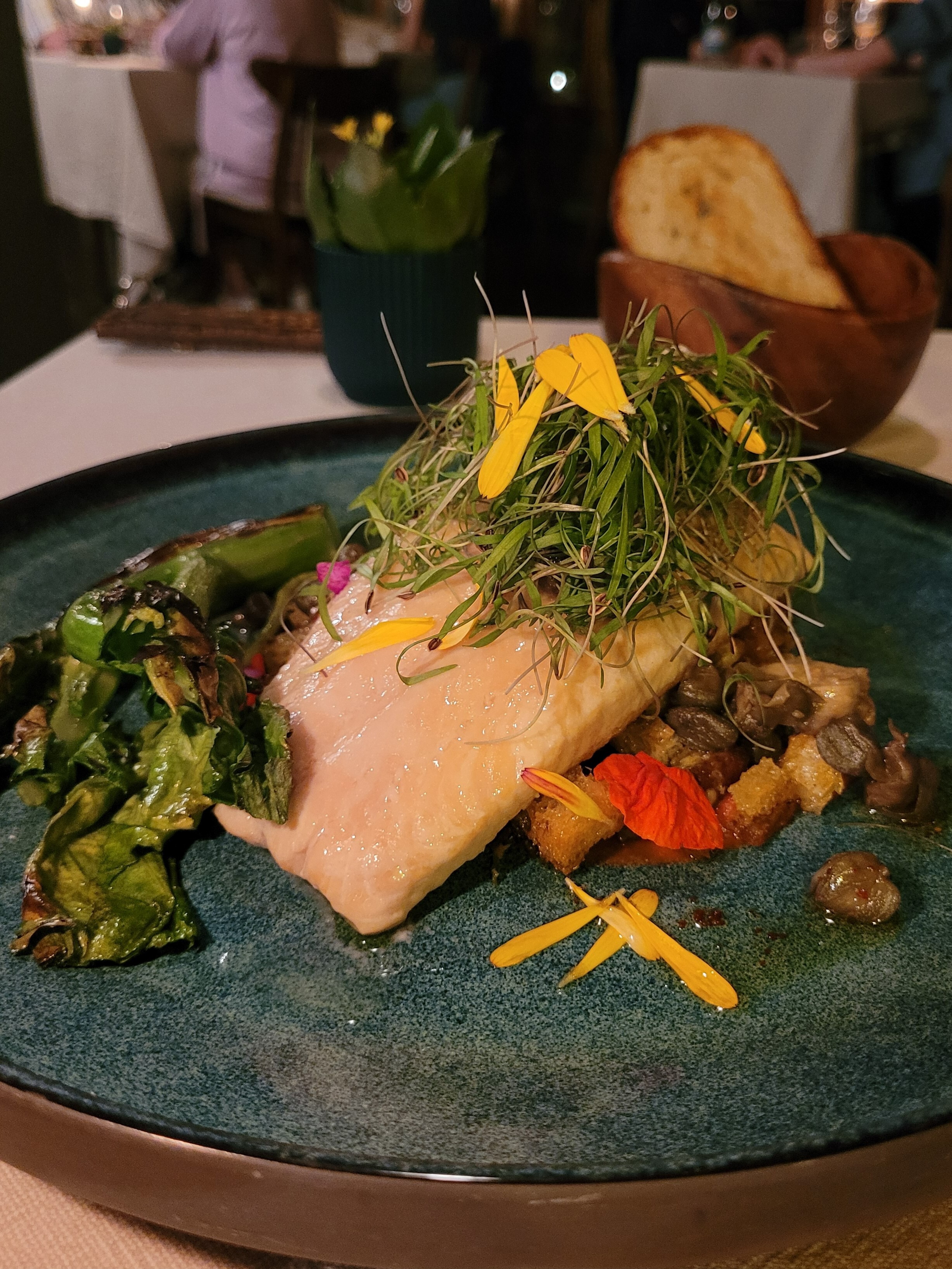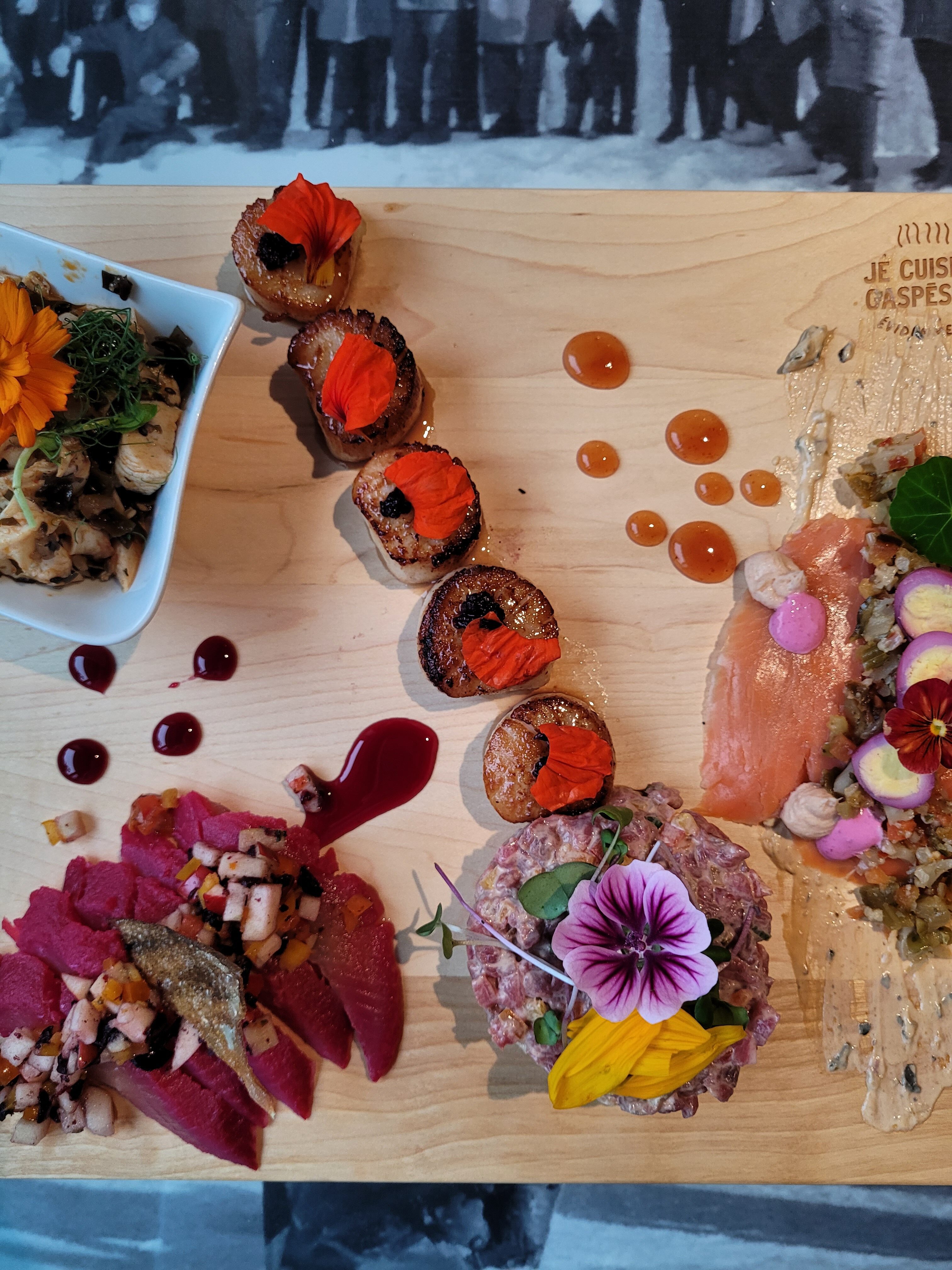 Si j’ai beaucoup aimé les huîtres (pêchées à quelques centaines de mètres du restaurant), dressées en compagnie d’un kimchi d’algue, d’œufs de saumon et d’herbes du jardin, j’ai eu un coup de cœur pour la planche chargée de délicieux produits de la région : pétoncles saisis avec confit de baie d’aronia, gravlax de truite à la betterave et sa garniture de pomme, saumon fumé, salade de bourgots et algues, tartare de bœuf… Quelle belle vitrine de ce qu’il se fait en Gaspésie !