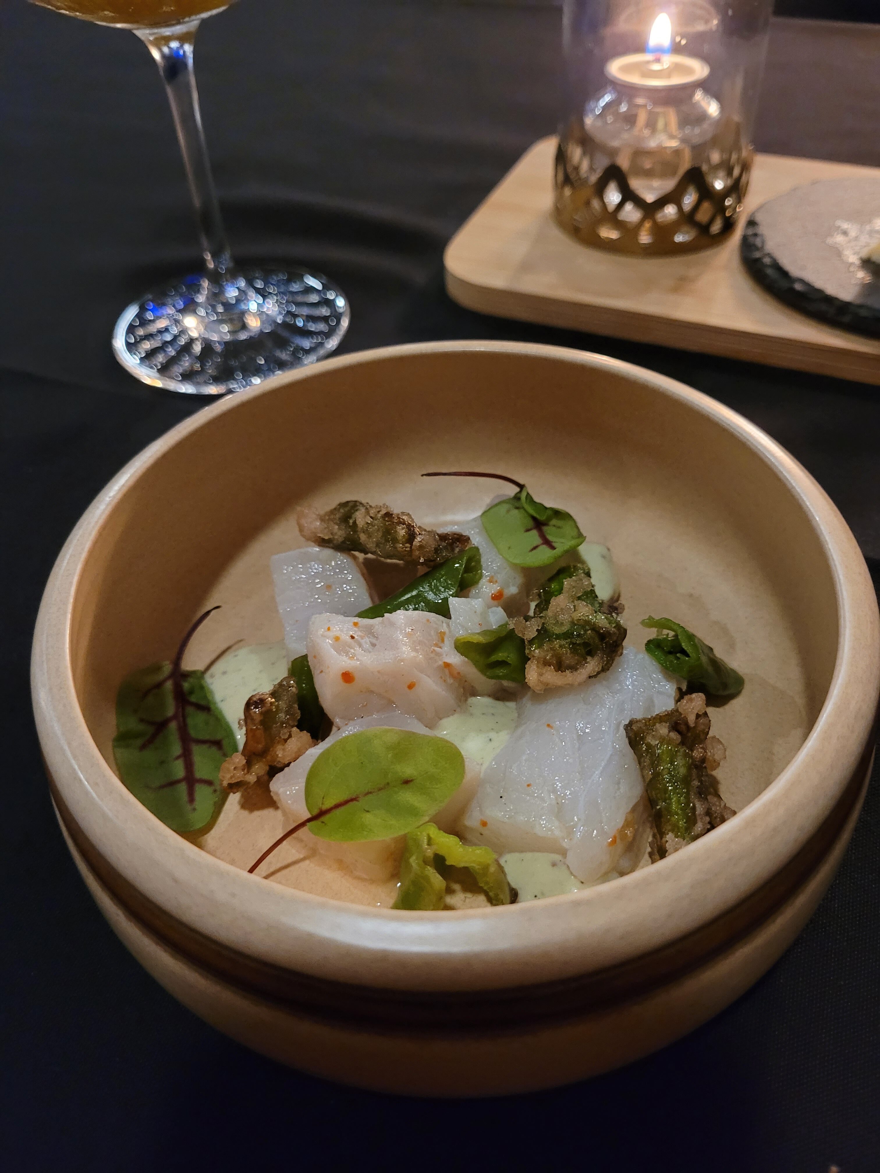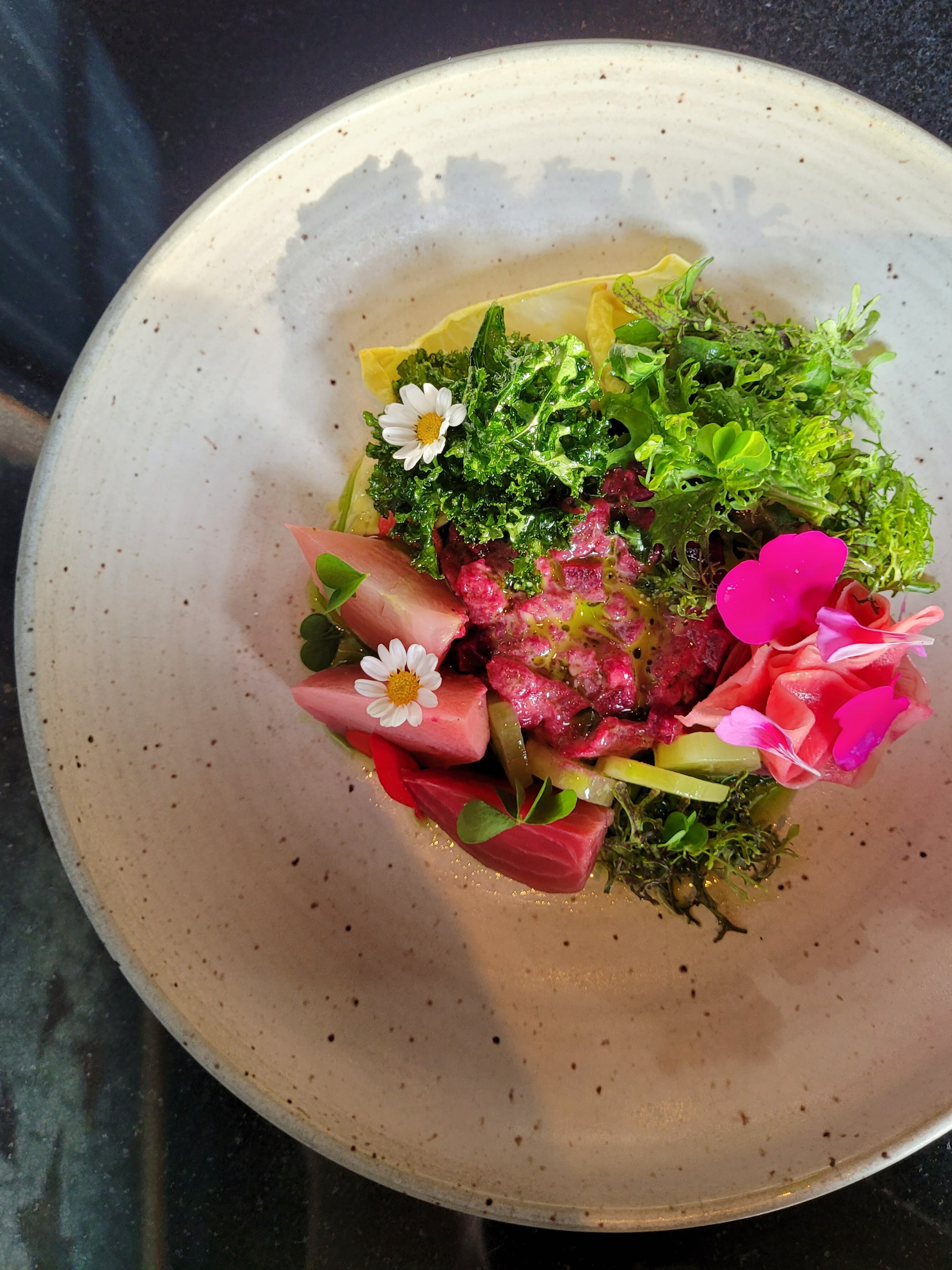 Le plaisir débute – et se termine tout en texture avec kale frit, quartiers de radis pochés ainsi qu’en fines lamelles marinées, lanières de celtuce (aussi appelé laitue asperge) et feuilles d’endives. Imaginez la satisfaction à déguster ce plat : créer sa propre bouchée parfaite, combiner les différentes textures, expérimenter de nouvelles saveurs… Un vrai terrain de jeu, qui se poursuit pour 5 autres services ! Les végétariens et les végétaliens auront également tout le même plaisir à plonger dans l’univers du chef.