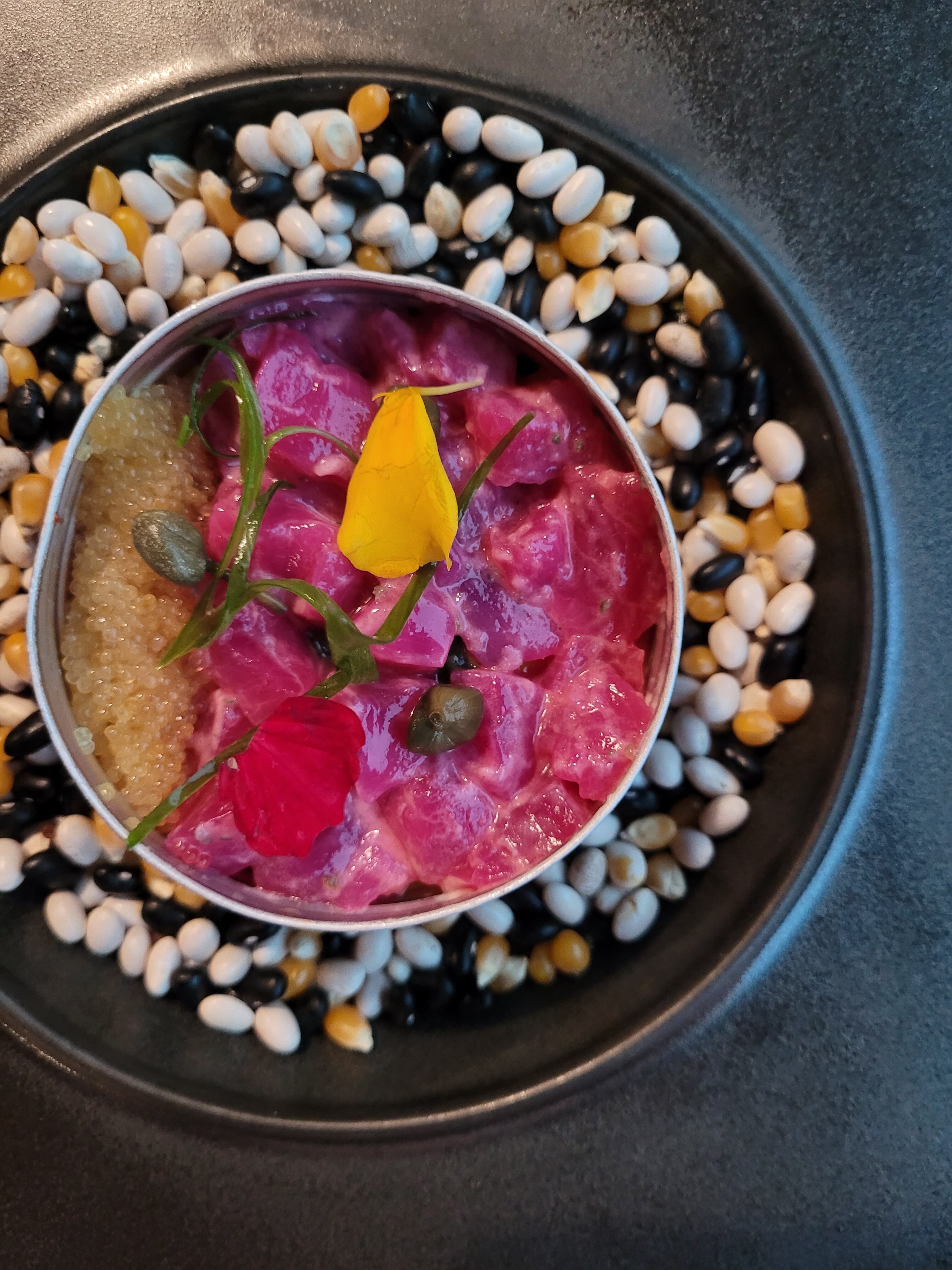 Le chef à la barre est Sean Murray Smith, lui qui est reconnu par sa cuisine très intellectuelle, artistique et novatrice. Dès le premier service, on est transporté dans son univers créatif : un tartare de veau et de betteraves supporté par trois différentes textures de sauces : une émulsion à la moutarde, une seconde au lait de riz, puis une huile à la ciboulette.