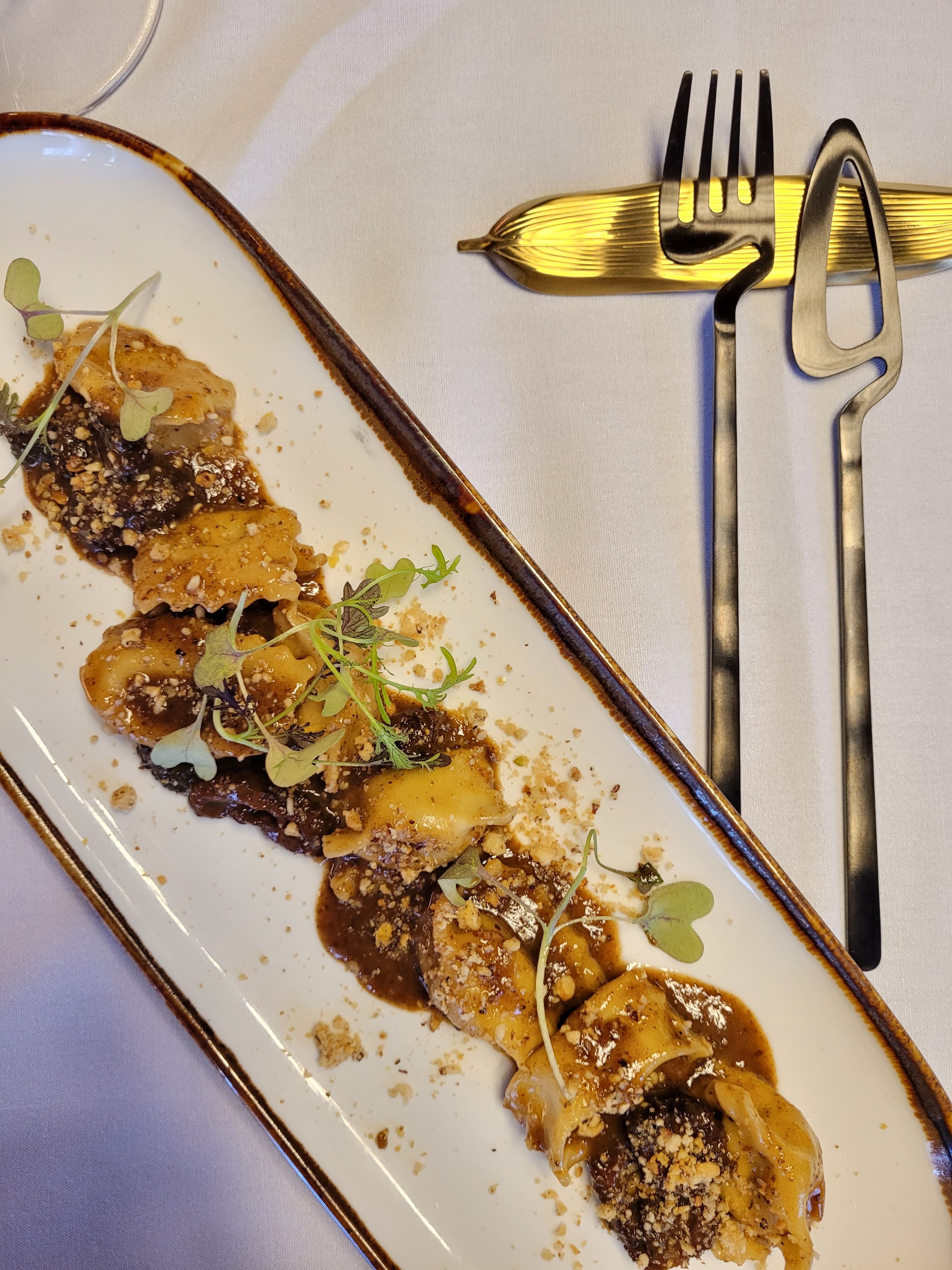 Beignet de bourgots façon « takoyaki », gravlax de cerf à la poudre d’épinette et sirop de bouleau, orgetto au nard des pinèdes avec purée de bardane, chou garni d’un effiloché de loup marin sont quelques exemples de plats qui m’ont particulièrement surpris. Toutefois, mon favori de la soirée fut les tagliatelles bicolores avec flétan et pétoncle, rehaussé d’une poêlée de champignons sauvages et de truffes des Appalaches.