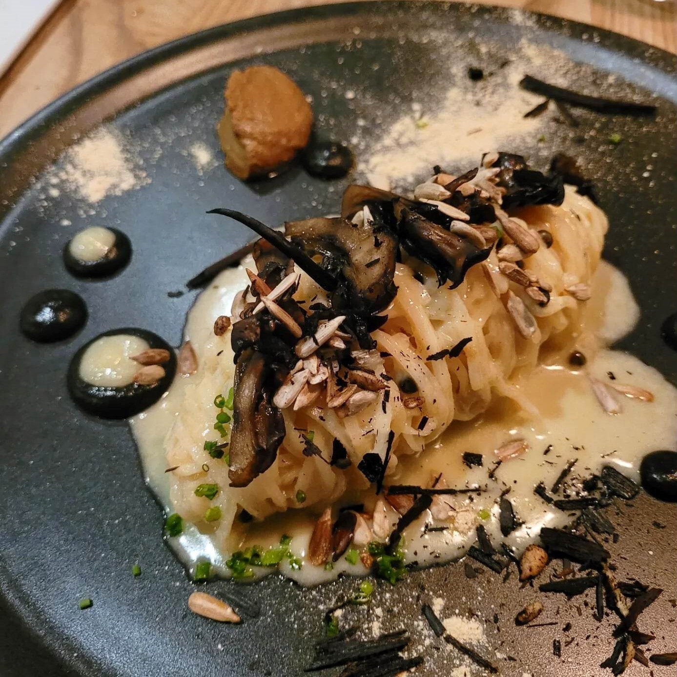 En plein mois de février, la gourmandise était bel et bien de la partouse avec des sauces travaillées avec amour (lire ici : beurre), mariées ici avec une morue qui floconne sans peine, là avec un bison au riche jus nappant et jazzé par deux textures de patates douces, sans oublier le « spaghetti » de céleri-rave gracieusement enveloppé d’une suave sauce crémeuse aux tournesols et champignons.