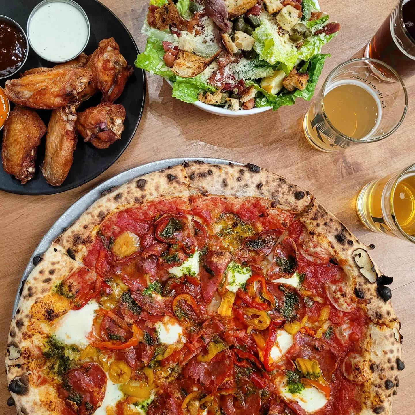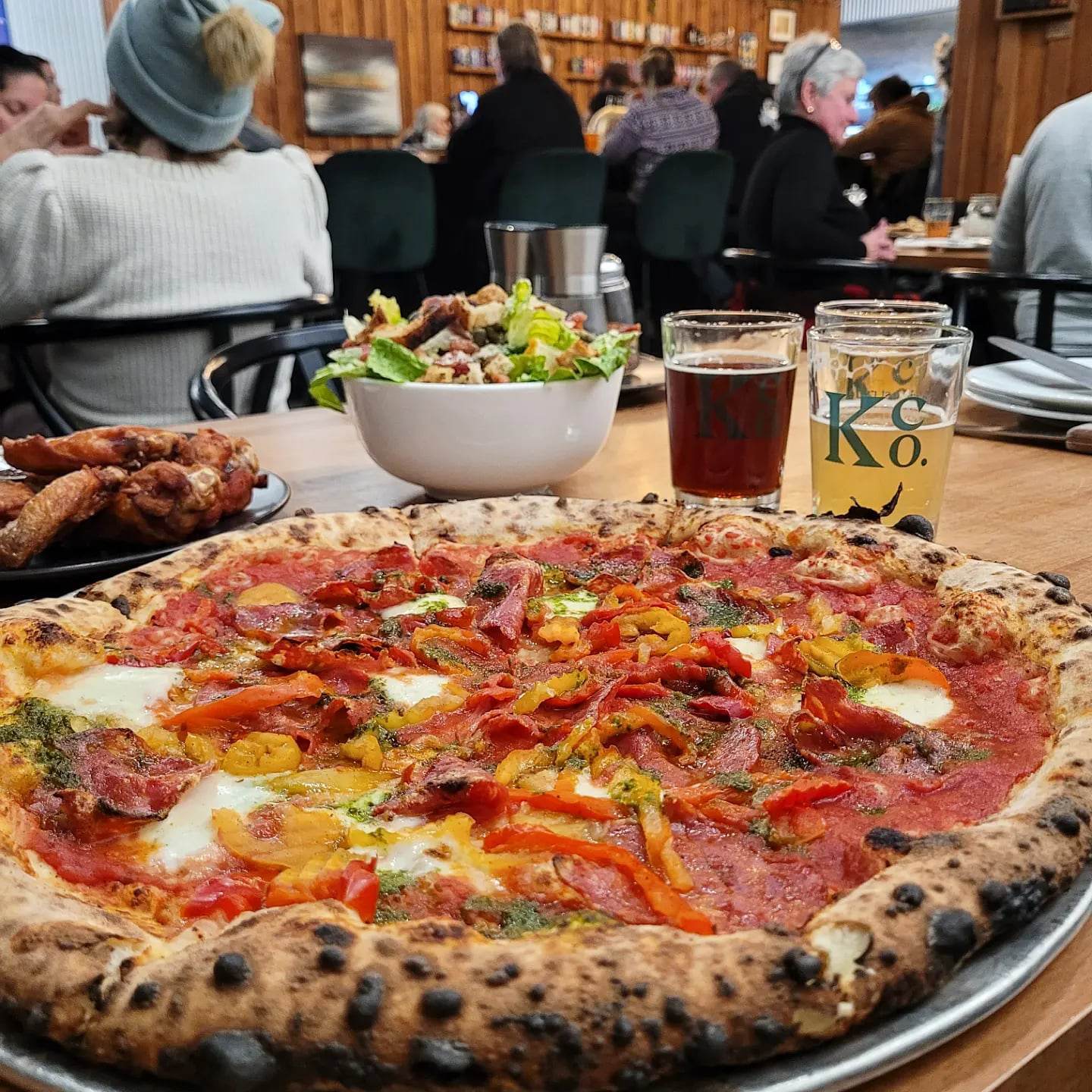 À manger, on craque littéralement pour la pizza néo-napolitaine : une savoureuse pâte au levain fermentée 48h-72h élaborée avec la farine d’une ferme située à quelques kilomètres de la microbrasserie, toujours généreusement garnie. Les puristes resteront avec la Margherita ou la Diavola (en photo), mais paraît-il que le meilleur vendeur est celui au smoked meat ! Des petites ailes de poulet bien craquantes saumurées à la bière en entrée, et le second verre ne se fera pas attendre. Une très belle découverte !