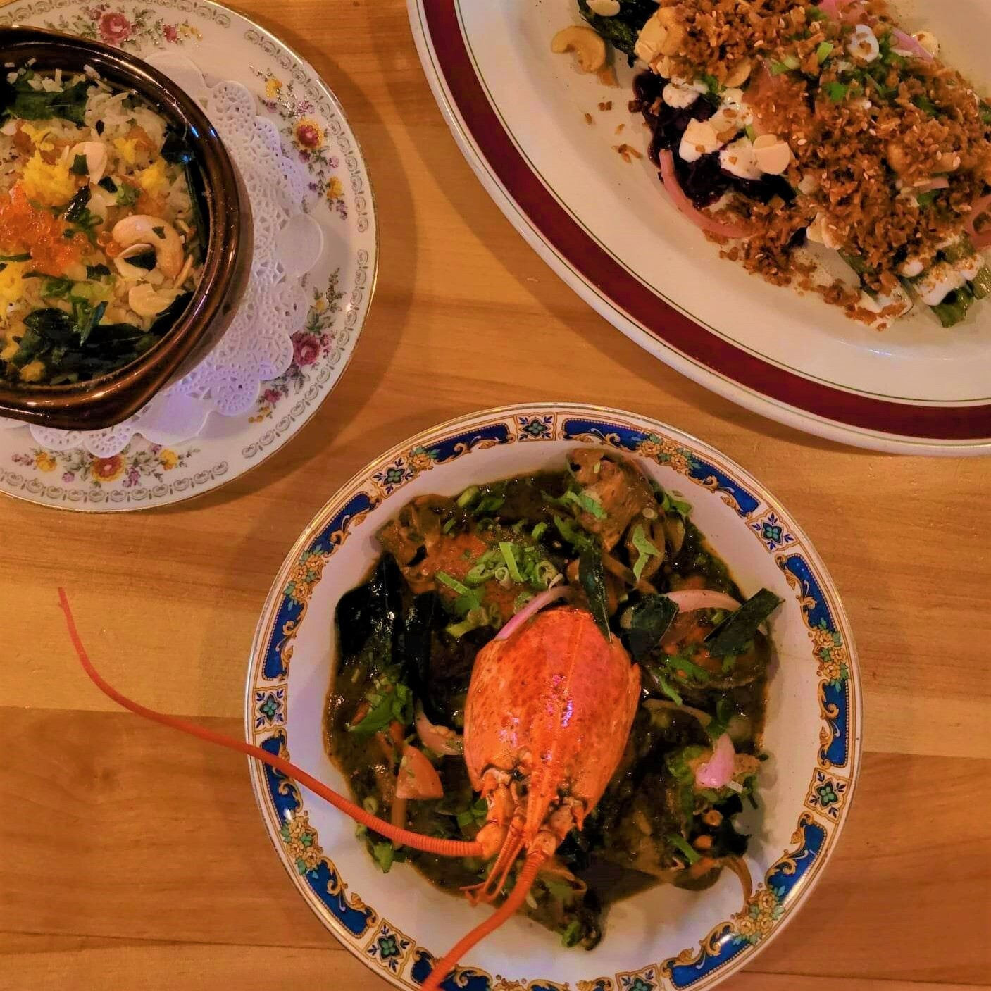 Le Palak Bergeron, en plus de faire sourire, met drôlement l’eau à la bouche une fois qu’il est expliqué. Au lieu d’être garni de fromage indien paneer, ce curry crémeux à base de crème d’épinards et de patates douces cache de coquins morceaux entiers de fromage en grains, à moitié fondu. D’autres accords indo-québécois suivront : un kooloo avec bourgots et mactres de Stimpson, un omble entier du Québec cuit en feuille de bananier avec une garniture aromatique qui fait littéralement voyager, un riz biryami au crabe des neiges absolument fabuleux, un curry tomaté au homard de la Gaspésie, des pakora (beignets frits) parfois aux champignons locaux, parfois aux crevettes nordiques… Même les desserts y passent, avec un « Grand-père » jamun, un délicieux clin d’œil au gulab jamun et les grands-pères dans le sirop. Bien joué !