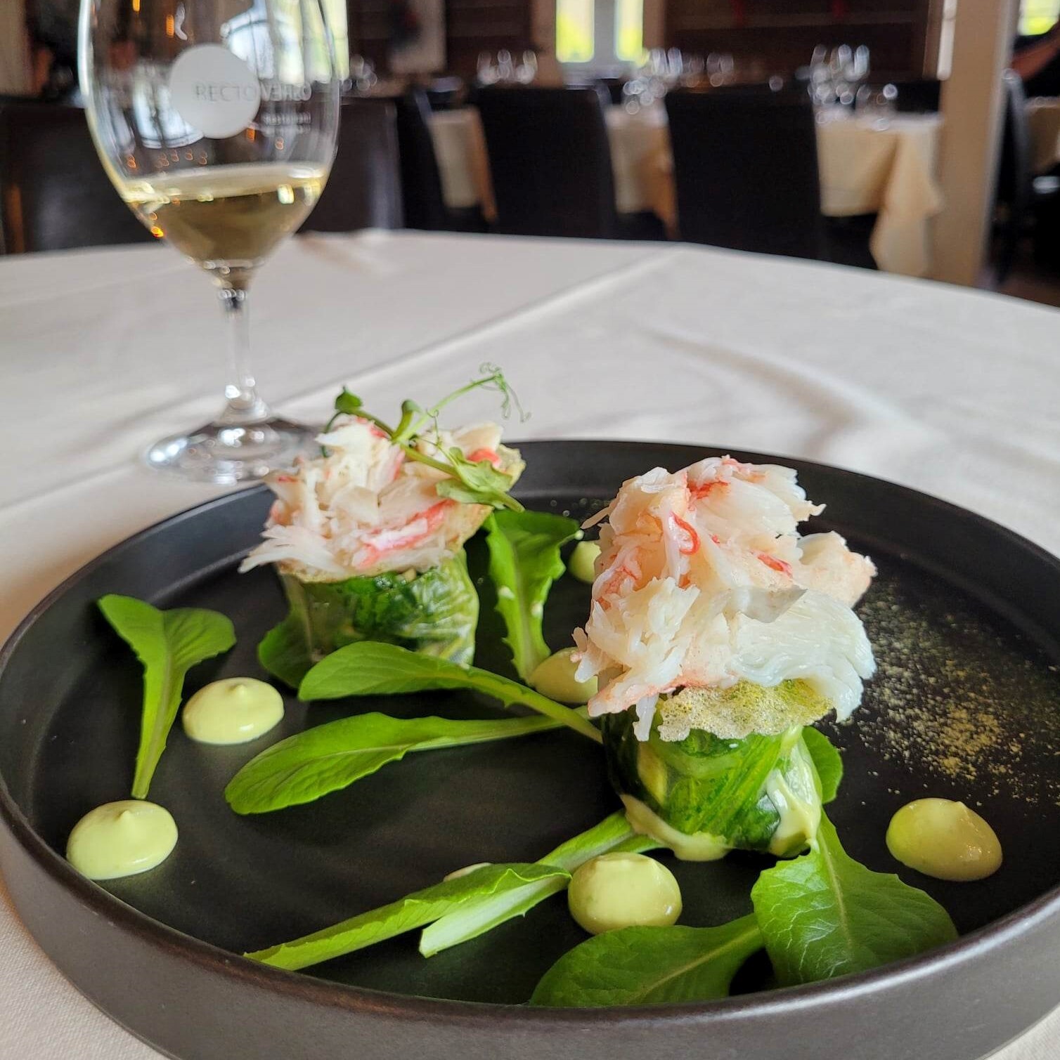 Je me suis installé à sa table début mai, et déjà, j’ai eu le plaisir de déguster plusieurs produits fraîchement cueillis : premières têtes de violon de la saison, pousses d’hémérocalles (aussi appelées poireaux hémérocalles puisqu’elles ont un goût de poireau), ail des ours (ou ail des bois, reconnus pour sa délicate saveur d’ail et très versatile en cuisine), mizuna (feuille de moutarde, qui se consomme très bien en salade), agastache (plante aux saveurs mentholées, plus ou moins fruitées), et probablement d’autres verdures qui ont passé sous mon radar. À cela s’ajoutent crabe des neiges, crevettes nordiques, flétan de la Gaspésie… Un menu qui respire le printemps, et ça fait du bien ! J’ai particulièrement aimé les rouleaux de printemps au mizuna, concombre et céleri, orné par une généreuse portion d’effiloché de crabe frais, auquel on prend un malin plaisir à tremper dans l’émulsion d’ail des ours… Un délice.