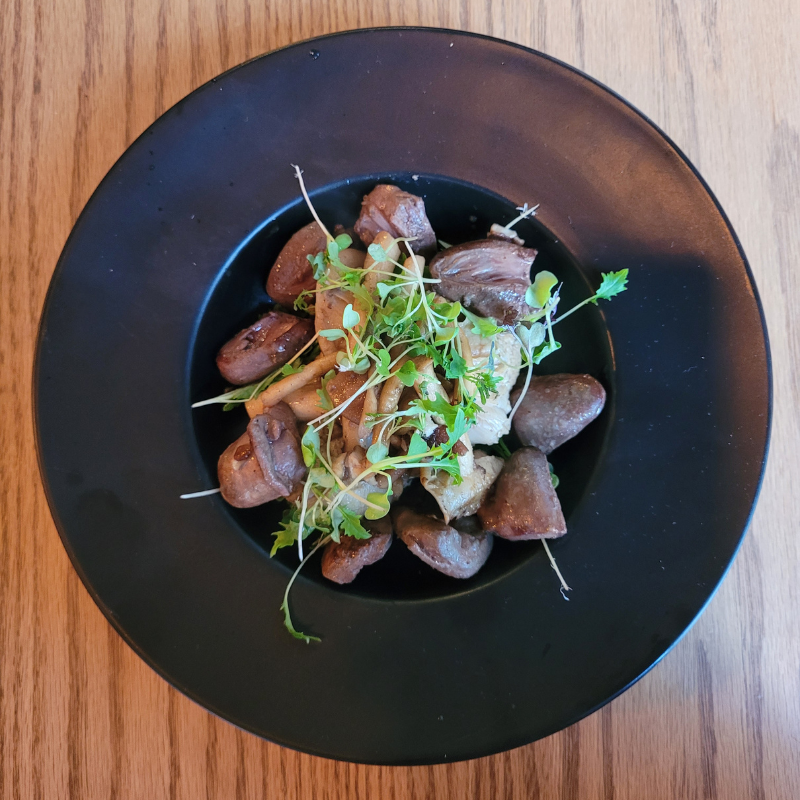 Mon choix s’arrête d’abord sur la tomate, présentée en plusieurs déclinaisons ; crue, macérée dans un jus d’argousier amenant une vivacité complémentaire puis en eau, m’approuvant ainsi d’avoir sélectionné le pain maison. C’est frais, c’est léger, ça goûte l’été… Et ça met en appétit pour la suite. Des crevettes nordiques bien salines baignant dans un dashi (bouillon fait avec des algues), additionné de quelques dés et lanières de kohlrabi (chou-rave), emmenant ainsi la texture nécessaire. J’ai terminé avec les cœurs de canard, un abat que j’apprécie particulièrement, accompagnés d’une purée de champignons et de quelques fongus supplémentaires poêlés.